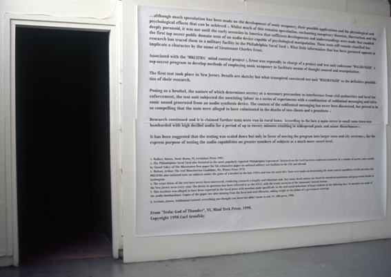 Works in the “ACS-X” series explore the relationship between context and duplicity. Presenting the viewer with a large scale text detailing specific narratives around the development of a secret military thought control weapon, the work creates and manipulates a context within which is presented an abstract audio work. The audio is played at high volume and, as advised on the entrance to the blackout enclosure, contains subliminal messages. The work examines not only what we are presented with as information but how it is presented to us. The vernacular of conspiracy theory is appropriated to construct a suitable fiction for the preparation of the viewer, while the text is a fabrication the subliminal messages are not.
