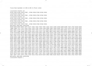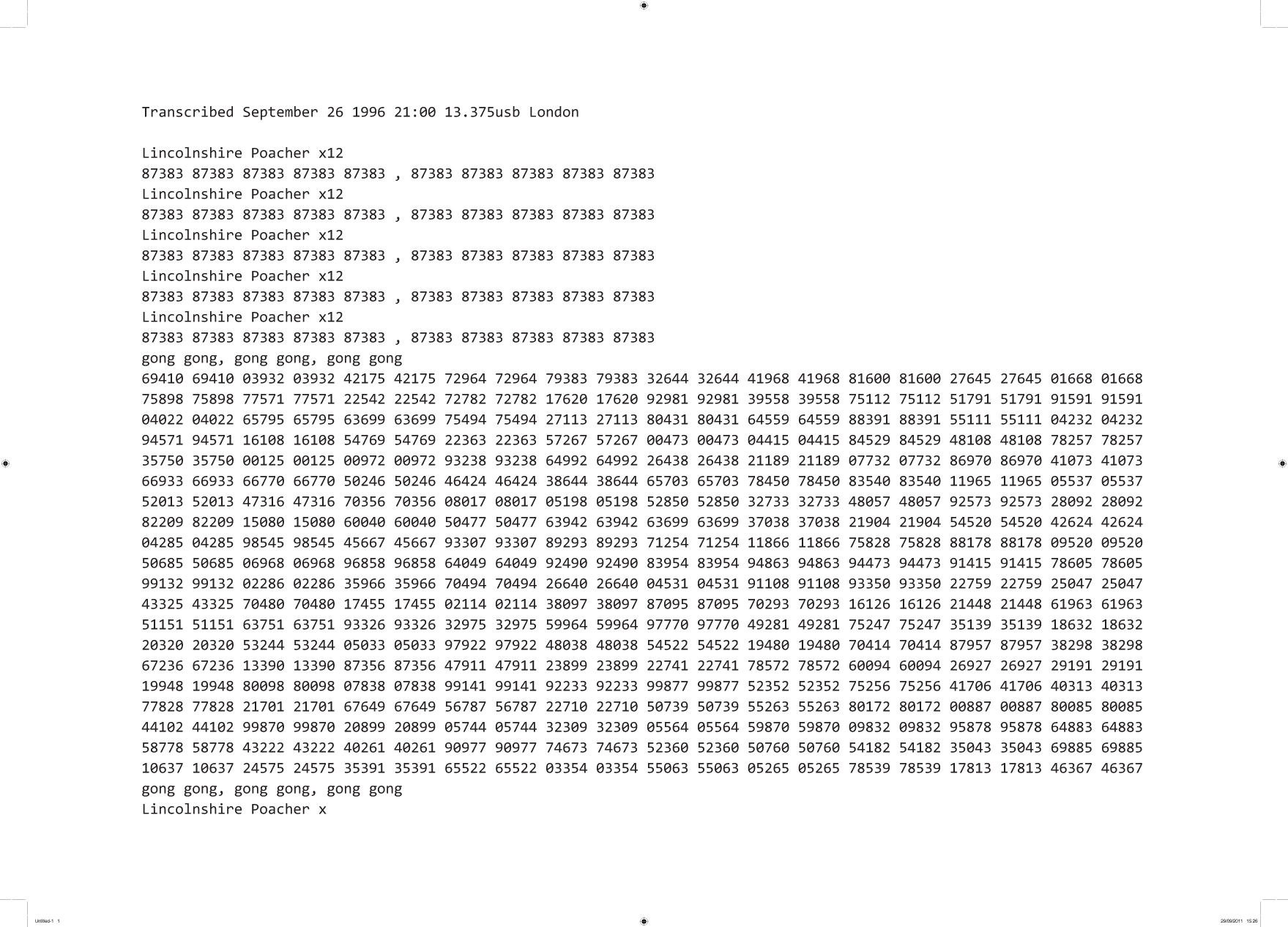 Transcription of a broadcast from the 'Lincolnshire Poacher' number station. These broadcasts, and many others like them, remain undecoded.